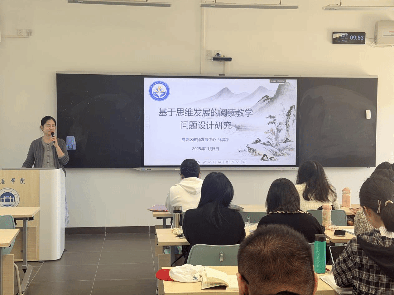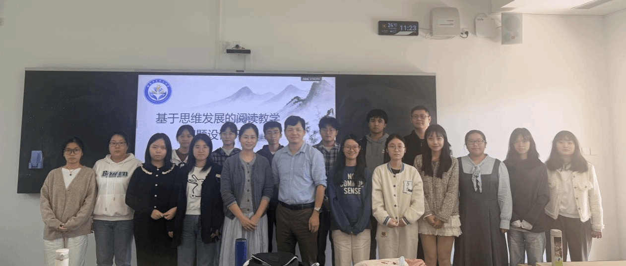 本网讯 11月5日上午,为助力学科语文研究生夯实教学理论基础、提升阅读教学设计能力,张志帆老师邀请了高要区资深语文教研员徐高平老师开展一场以“基于思维发展的阅读教学问题设计研究”为主题的专题讲座。徐老师以一线教学观察为切入点,结合中高考命题趋势与前沿教育理论,为我院2025级学科教学(语文)专业研究生带来了一场兼具深度与实操性的教学盛宴。