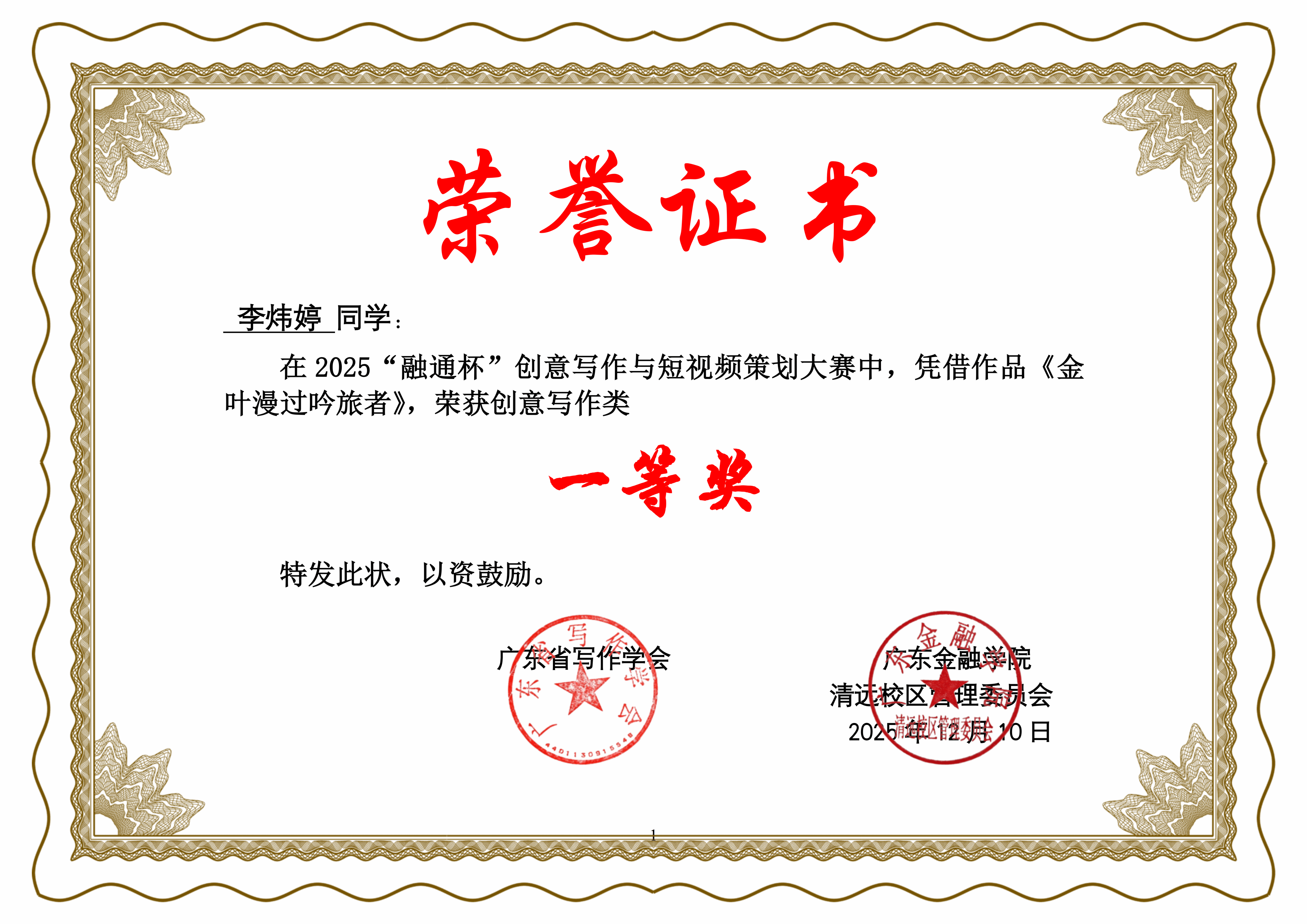 本网讯 近日,由广东金融学院清远校区管委会和广东省写作学会联合主办,京东数智现代产业学院承办的省职教城2025“融通杯”创意写作与短视频策划大赛圆满落幕。肇庆学院文学与传媒学院汉语言文学专业2023级卓越班李炜婷同学凭借短篇小说《金叶漫过吟旅者》在创意写作赛道中脱颖而出,荣获一等奖。