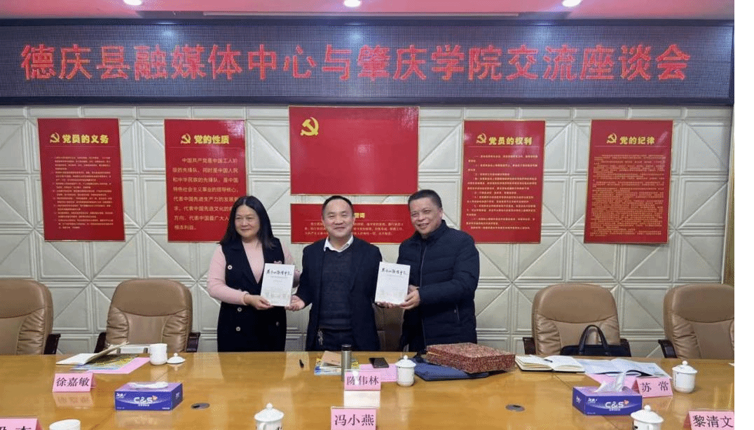 双方举行交流座谈会。陈伟林与苏常分别介绍了我院的办学特色、师资力量、人才培养成果及学科发展方向。德庆县融媒体中心主任冯小燕与副主任黎清文详细介绍了中心的发展历程、主要职能及在服务地方经济社会发展中所发挥的积极作用。双方围绕深化校地合作进行了深入探讨,并在共建本科生教学实践基地、联合开展德庆特色文化研究与传播、促进理论与实务互动等方面达成共识。
