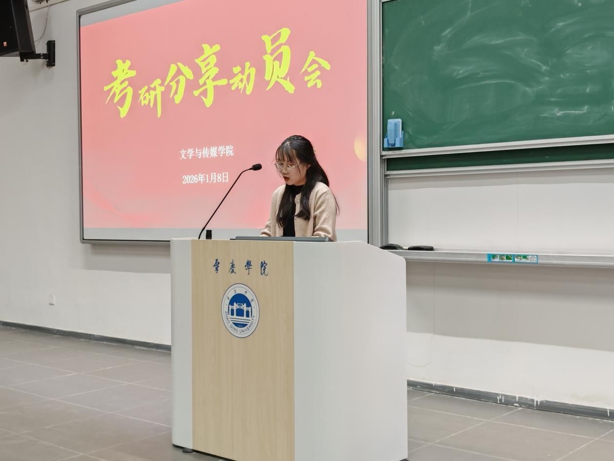 本网讯 为帮助同学们明确考研备考策略与择校逻辑,我院于2026年1月8日晚在新建教学楼B107成功举办“考研与申研经验分享会”。本次会议邀请到2021级汉语言文学专业校友巫婧雯、2021级广播电视学专业校友郭欣怡、2021级汉语言文学专业校友吴培桦以及2021级汉语言文学专业校友陈诗婷担任分享嘉宾,由学院党委委员、辅导员牛亚囡老师主持。现场气氛热烈,互动交流踊跃。