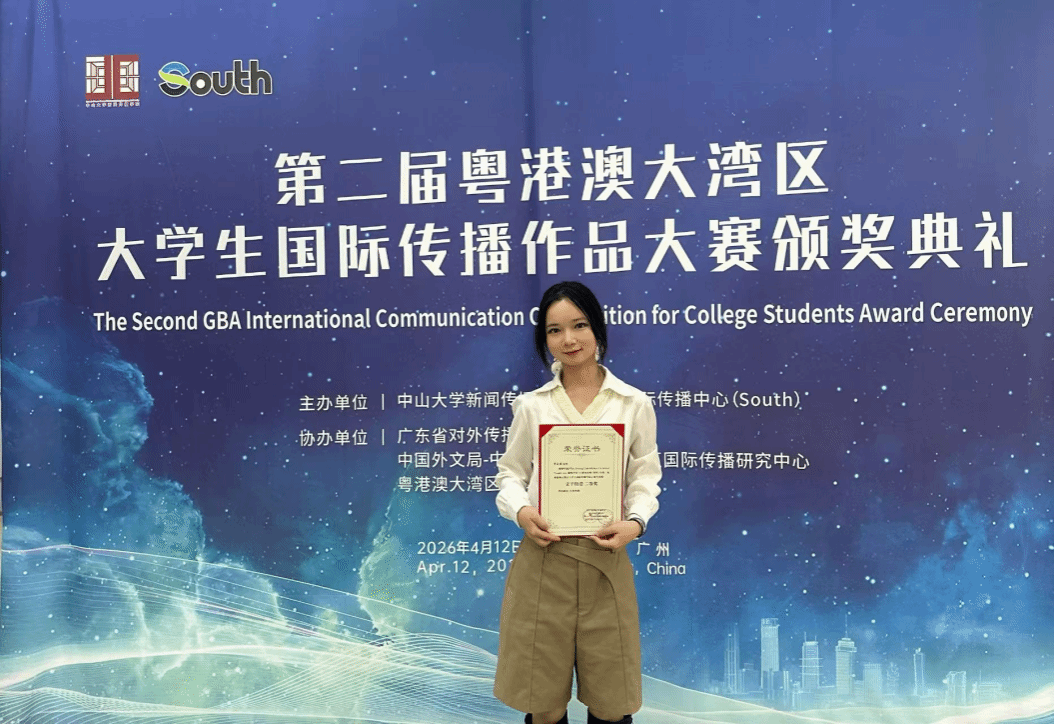 本网讯 4月12日,第二届粤港澳大湾区大学生国际传播作品大赛活动颁奖典礼在中山大学广州校区东校园隆重举行,2023级广播电视学1班的万芷滢作为获奖代表受邀出席赛事颁奖礼。最终,在与复旦大学、上海交通大学、中山大学等全国49所高校学子的激烈竞逐中,万芷滢同学的非虚构写作作品《糖鸡少年》在本届赛事中斩获佳绩,荣获该赛事文字报道的二等奖,这展现了文传学子扎实的新闻采写功底。
